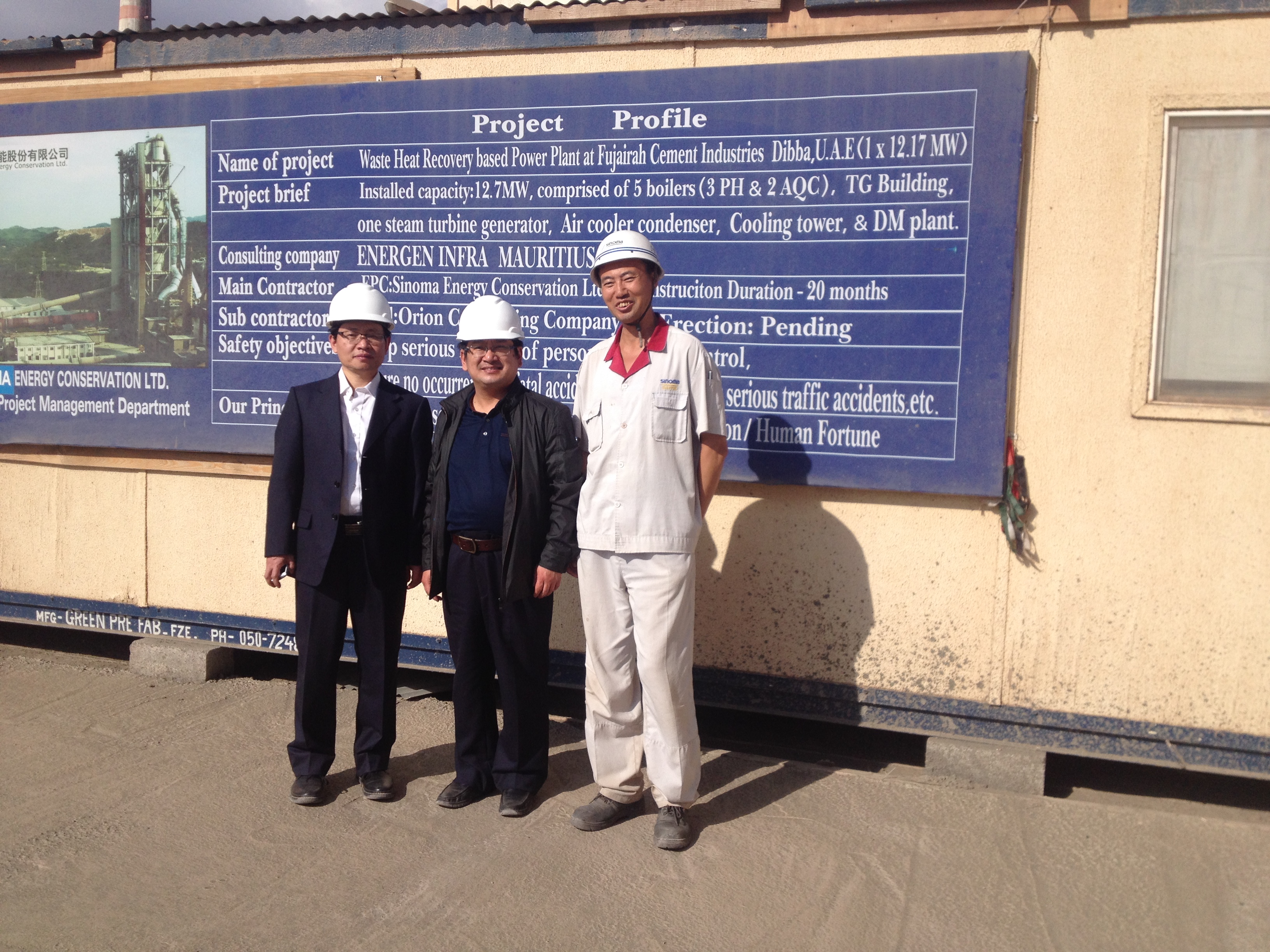 第二天,葛立武又抵達阿聯酋另一個項目部--Fujairah水泥廠。在該公司葛總會見了Fujairah水泥廠的總經理Mhd. Khammas先生及余熱發電負責人MUTHTY先生。該余熱發電項目為2013年簽訂的EPC總承包項目,裝機12MW,目前多個子項目工程已經具備安裝條件,設備也已陸續進場。該項目負責人MUTHTY先生對中材節能項目團隊的工作給予了高度的評價,并希望雙方再接再勵,爭取做到工期提前,盡早并網發電。葛總表示,項目的安裝和質量是生命,在保證安全及施工質量的前提下,項目部要倒排工期,爭取早日并網發電,為業主早日創造收益。