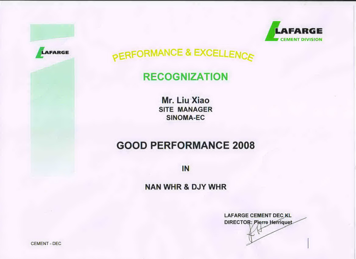 拉法基頒發(fā)給現(xiàn)場(chǎng)經(jīng)理劉宵的榮譽(yù)證書