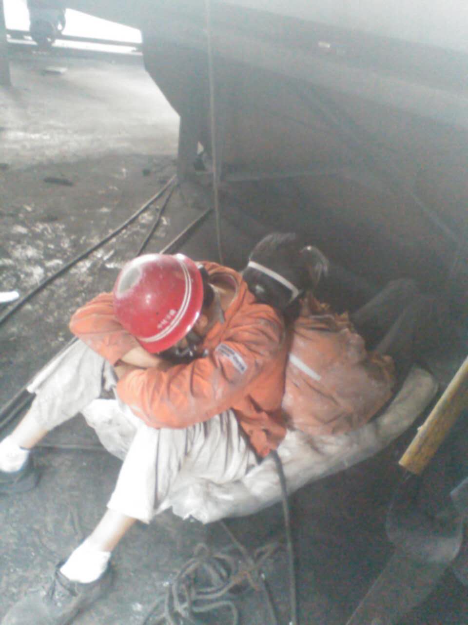 在高溫下連續作戰二十幾個小時,他們已經筋疲力盡,實在太困了,就在換班的間隙,互相依偎睡著了……