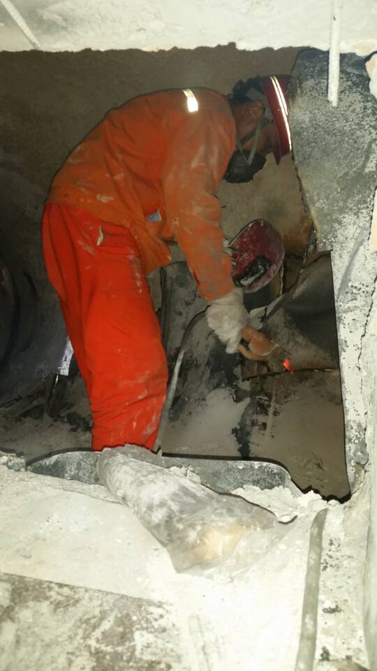 全廠沒有電源,意味著硅業收塵車間的引風機也停運,清灰工作就要在高溫且無負壓的條件下進行,煙道內的溫度達到70多度,向外噴熱煙塵,加上澆注料的熱輻射,進入煙道立刻汗流浹背。此種作業環境,在員工心里和生理上都是一項巨大的挑戰。更具挑戰性的是5#鍋爐割除不銹鋼板的工作,煙道內的電焊操作人員,需把不銹鋼板割成小于50cm的小塊,然后一塊一塊地從人孔門遞出。在此高溫環境下作業,每個操作員只能堅持十幾分鐘,輪流上陣。長時間的焊割作業,使每個人的面部都被烤的紅腫,疼痛。面對挑戰,中材節能人沒有退縮,而是爭分奪秒奮勇作戰。換班的間隙,許多員工兄弟們累得背靠背都能入睡。在中材節能龍陵子公司員工努力下,持續作戰二十個小時,如期完成檢修,全力保障運營,展現了中材節能人的責任、力量與風采。