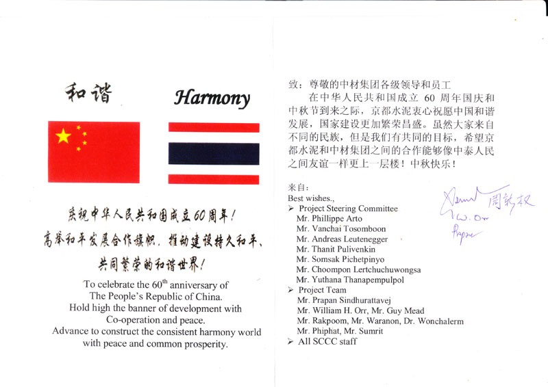10月1日,適逢中華人民共和國成立60周年和中秋佳節(jié)即將到來之時,京都水泥廠的Choompon Lertchuchuwongsa先生和Prapan Sindhurattavej先生代表京都水泥廠的領(lǐng)導(dǎo)團(tuán)隊和全體員工前往中材節(jié)能京都項目部,共同慶祝中華人民共和國成立60周年,向項目部全體人員致以節(jié)日的祝賀,送上了月餅、水果等節(jié)日禮品,并轉(zhuǎn)達(dá)了京都水泥對中材集團(tuán)和中材節(jié)能全體領(lǐng)導(dǎo)和員工的誠摯祝福。