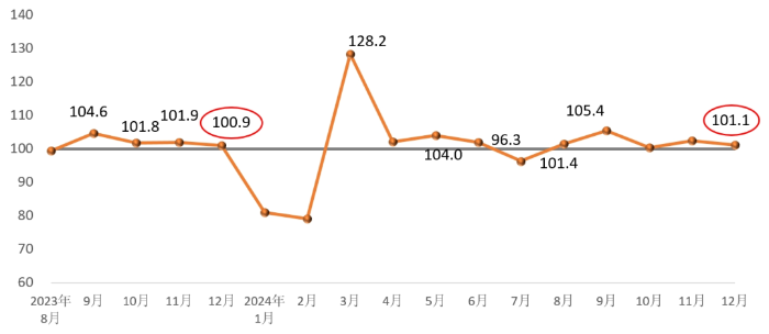 On the supply side, the price index and production index for the construction materials industry were both above the critical point in December. Among them, the building materials industry price index 100.1 points, 1.3 points lower than last month; building materials industry production index 101.0 points, the same as last month. Overall, the production of building materials products is stable, prices continue to stabilize.